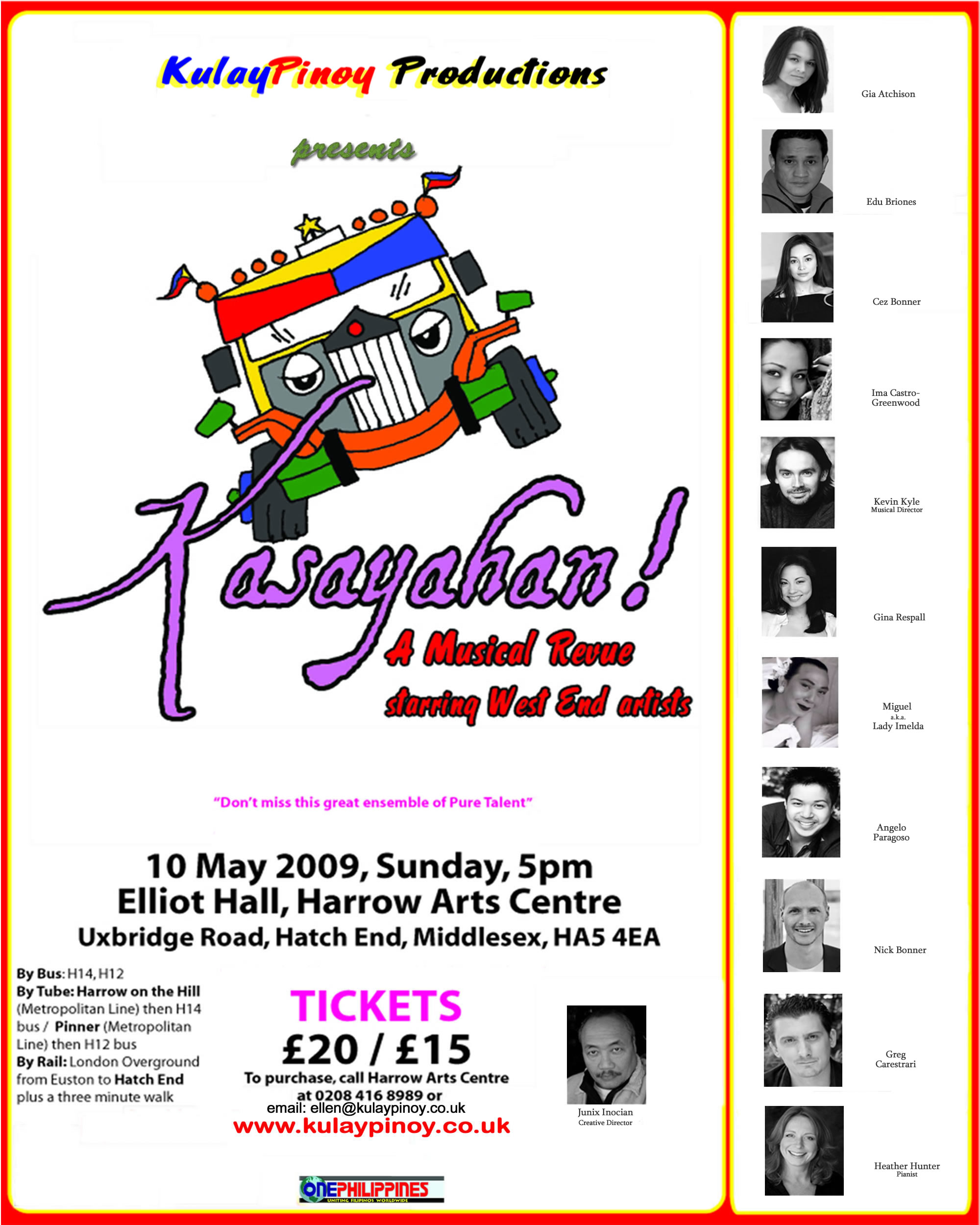 Kulay Pinoy, a new production outfit, is launching its first production entitled “Kasayahan!” on the 10th of May 2009. “Kasayahan!” is a concert featuring Filipino and British performers singing Filipino songs and excerpts from west-end and broadway musicals.